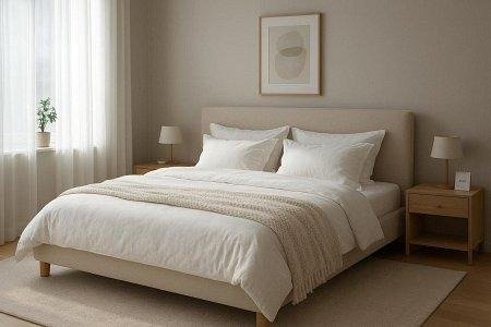 Eine beliebte Variante ist der „Cloud-Bed“-Look: ein beiges Polsterbett, weiße Bettwäsche, ein heller Hochflor-Teppich und weiße Vorhänge. Das Ergebnis ist ein sehr heller, fast schwebender Gesamteindruck. Wer mehr Wärme möchte, kombiniert das Bett mit Nachttischen aus dunklem Nussbaumholz und Textilien in Ocker oder Senfgelb – das wirkt gemütlich und geerdet.